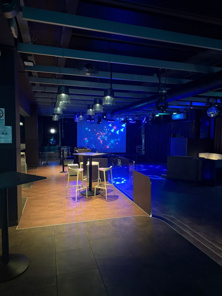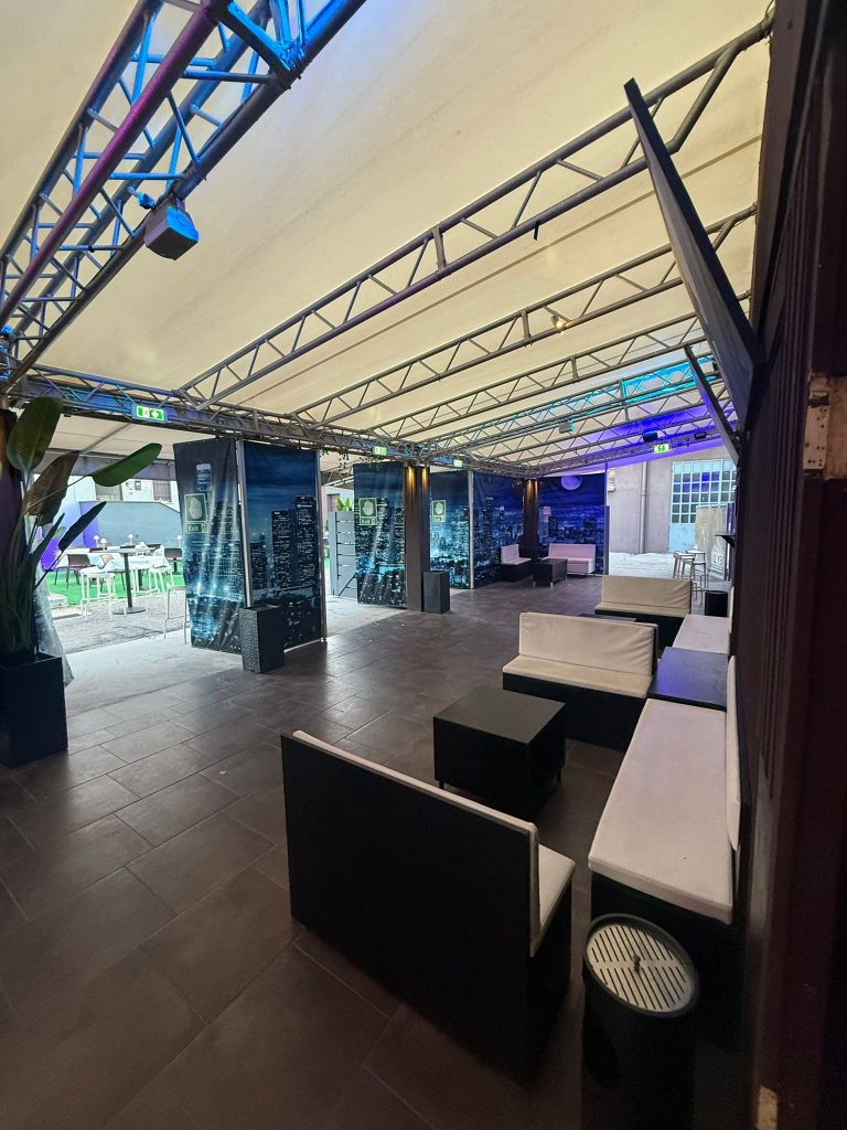- Un palco già allestito, perfetto per speech, performance artistiche o DJ set;